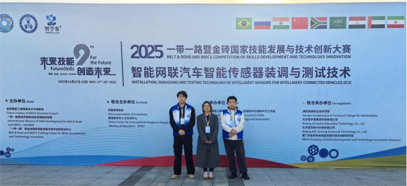 2025"一带一路"暨金砖国家技能发展与技术创新大赛之“智能网联汽车智能传感器装调与测试技术”赛项决赛于2025年11月26-29日在湖南湘西民族职业技术公司成功举办,yl23411永利尹金楷、金银平两位老师指导的24级智能网联汽车技术专业员工薛庭辉、曹晓灿,凭借扎实的技能功底与出色的现场表现,从全国众多参赛队伍中脱颖而出,荣获高职组铜牌,为公司新能源汽车技术专业群中智能网联汽车技术专业再添荣誉,助力高水平专业群的蓬勃发展。