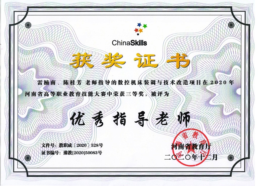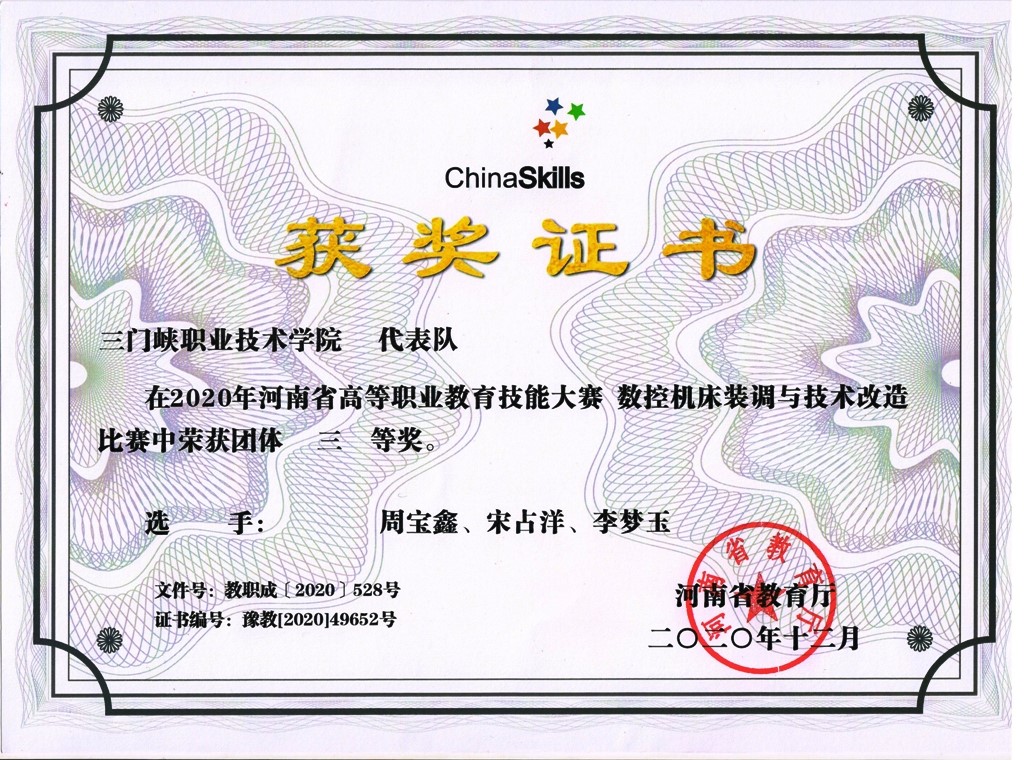 近日,河南省教育厅关于公布2020年河南省高等职业教育技能大赛获奖名单的通知 (教职成〔2020〕528号 ),公司数控技术专业员工周宝鑫、宋占洋、李梦玉团队参加的“数控机床装调与技术改造”赛项荣获省级三等奖。