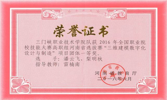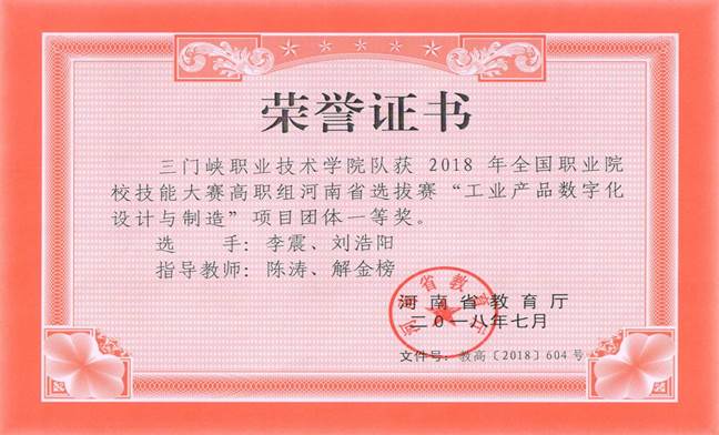 数控技术专业员工在国家级、省级技能大赛中成绩斐然。2019年,公司员工荣获全国第五届移动互联创新创业大赛总决赛高校组一等奖;2016-2018年,连续三年在河南省职业技能大赛暨全国高职院校技能大赛高职组河南省选拔赛“工业产品数字化设计与制造”项目荣获一等奖;2018-2019年,连续两年在“数控机床装调与技术改造”项目荣获二等奖;2020年,河南省高等职业教育技能大赛三等奖;第九届全国数控行业“机床装调维修工”河南省选拔赛三等奖。